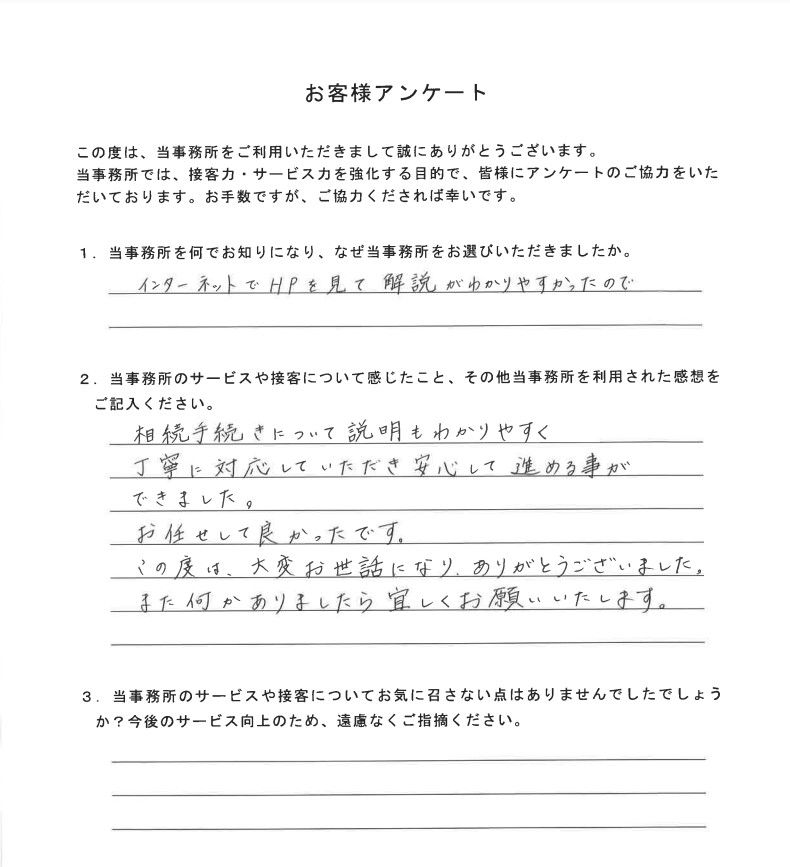 相続手続きについて説明もわかりやすく丁寧に対応していただき安心して進める事ができました。