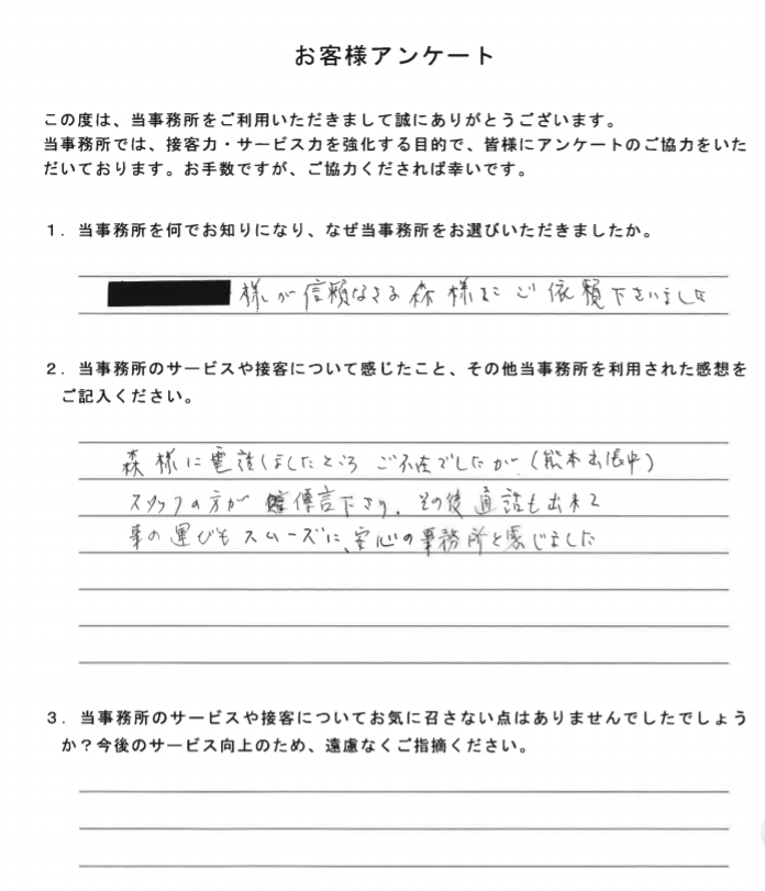 森先生に電話しましたところ、ご不在でしたが(熊本出張中)、スタッフの方が伝言下さり、その後電話も出来て、事の運びもスムーズに安心の事務所と感じました。