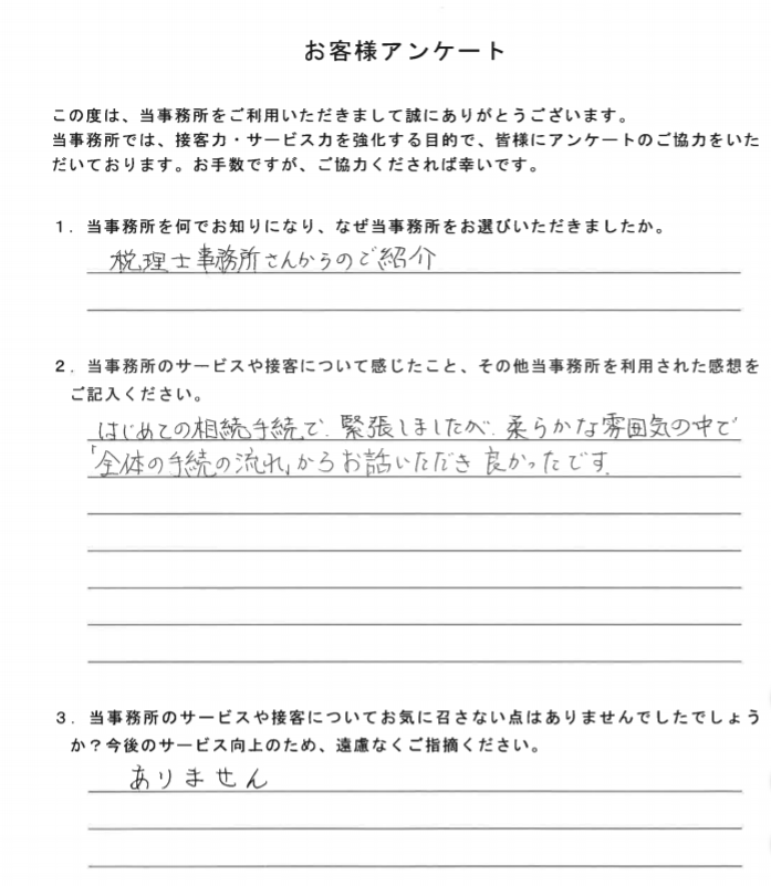 はじめての相続手続で緊張しましたが、柔らかな雰囲気の中で「全体の手続きの流れ」からお話いただき良かったです。
