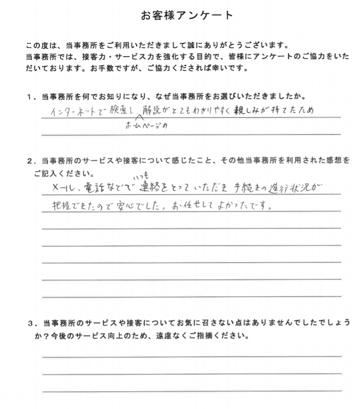 メール電話などでいつも連絡をとっていただき手続きの進行状況が把握できたので安心でした。お任せして良かったです。