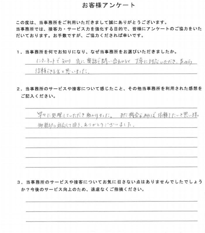 早々に処理していただき助かりました。また機会があれば依頼したいと思います。ご親切に対応していただきありがとうございました。