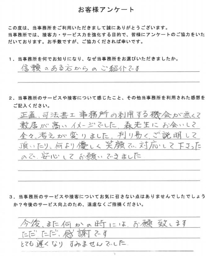 正直、司法書士事務所の利用する機会が無くて敷居が高いイメージでした。森先生にお会いして全く考えが変わりました。判り易くご説明して頂いたり、何より優しく笑顔で対応して下さったので、安心してお願いできました。