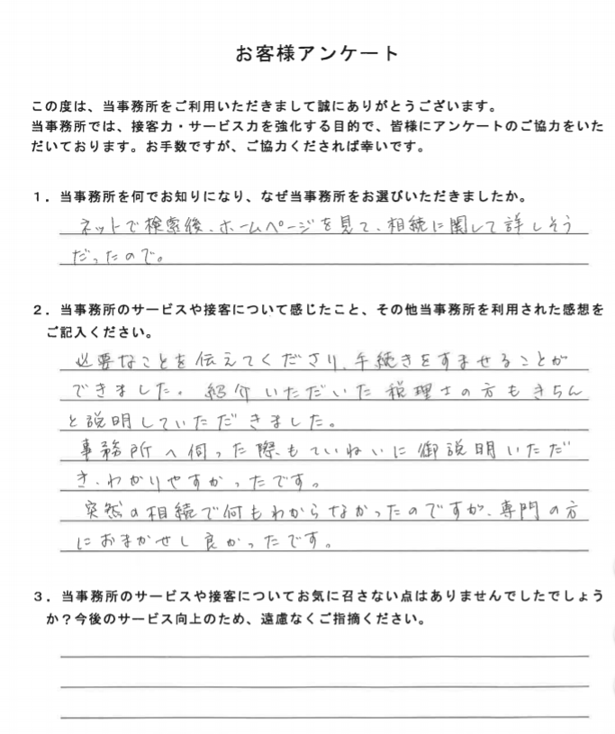 必要なことを伝えてくださり、手続きをすませることができました。紹介いただいた税理士の方もきちんと説明していただきました。事務所へ伺った際もていねいに御説明いただき、わかりやすかったです。突然の相続で何もかもわからなかったのですが、専門の方におまかせして良かったです。
